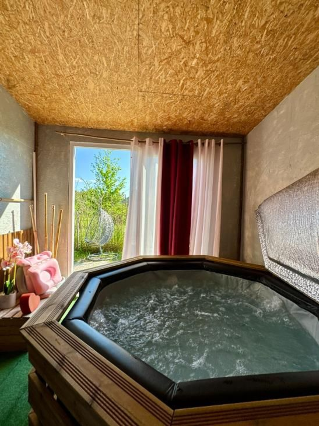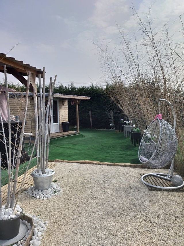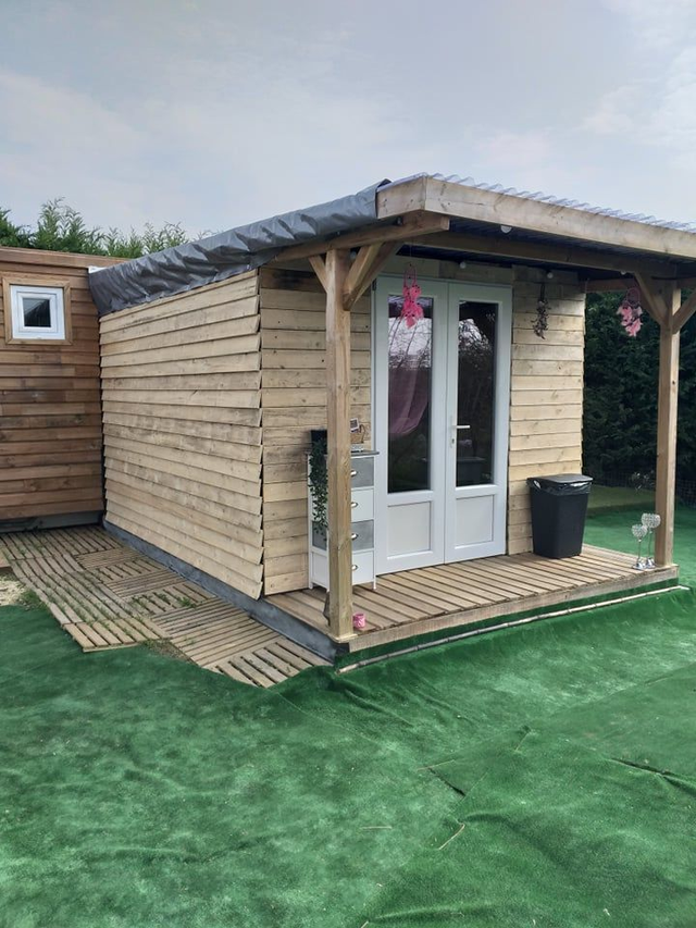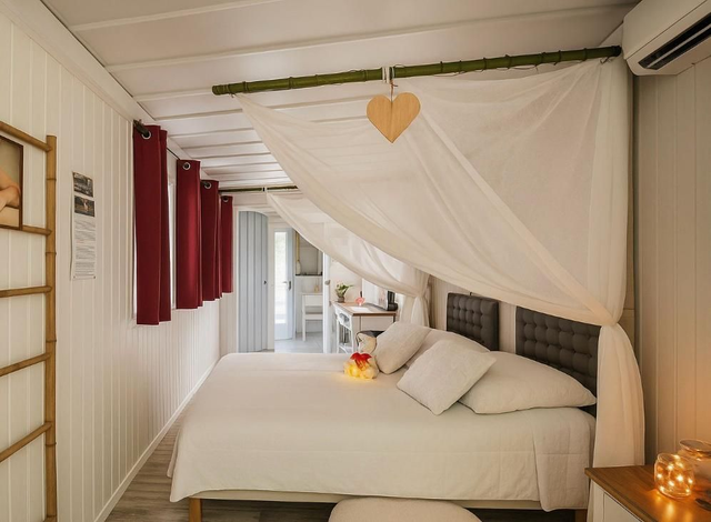 séjour (bungalow climatisé tout confort, accès spa, accès piscine en saison, cabane de restauration, terrasse couverte équipée et jardin